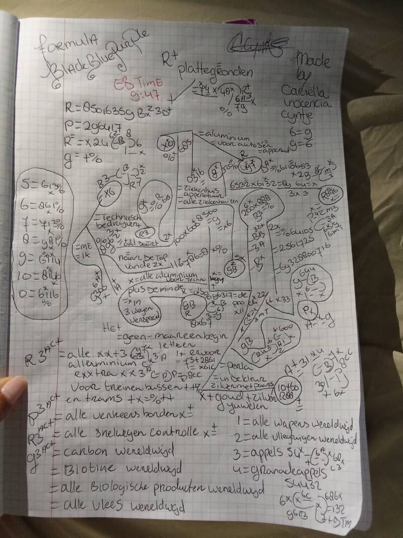 "FORMULA "BLACKBLUEPURPLE" #2. MADE BY CARIËLLA INOCENCIA CIJNTJE ID NUMMER NRL68CD99. DT13 "BLAUWESCHRIFT".