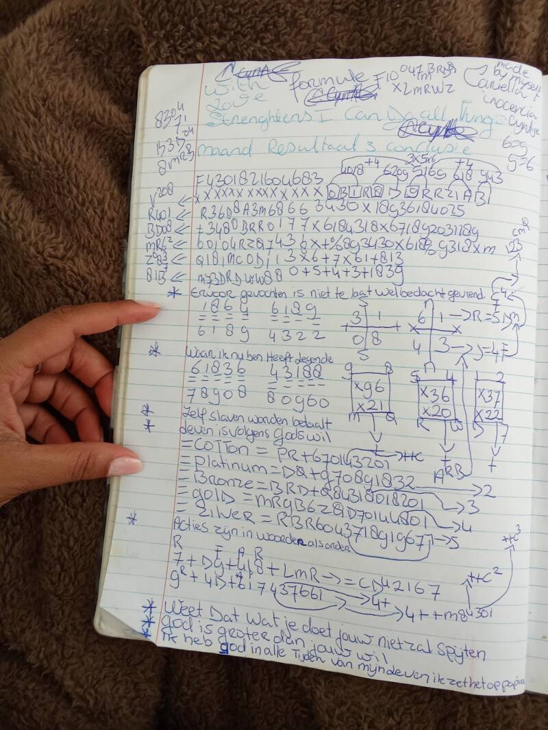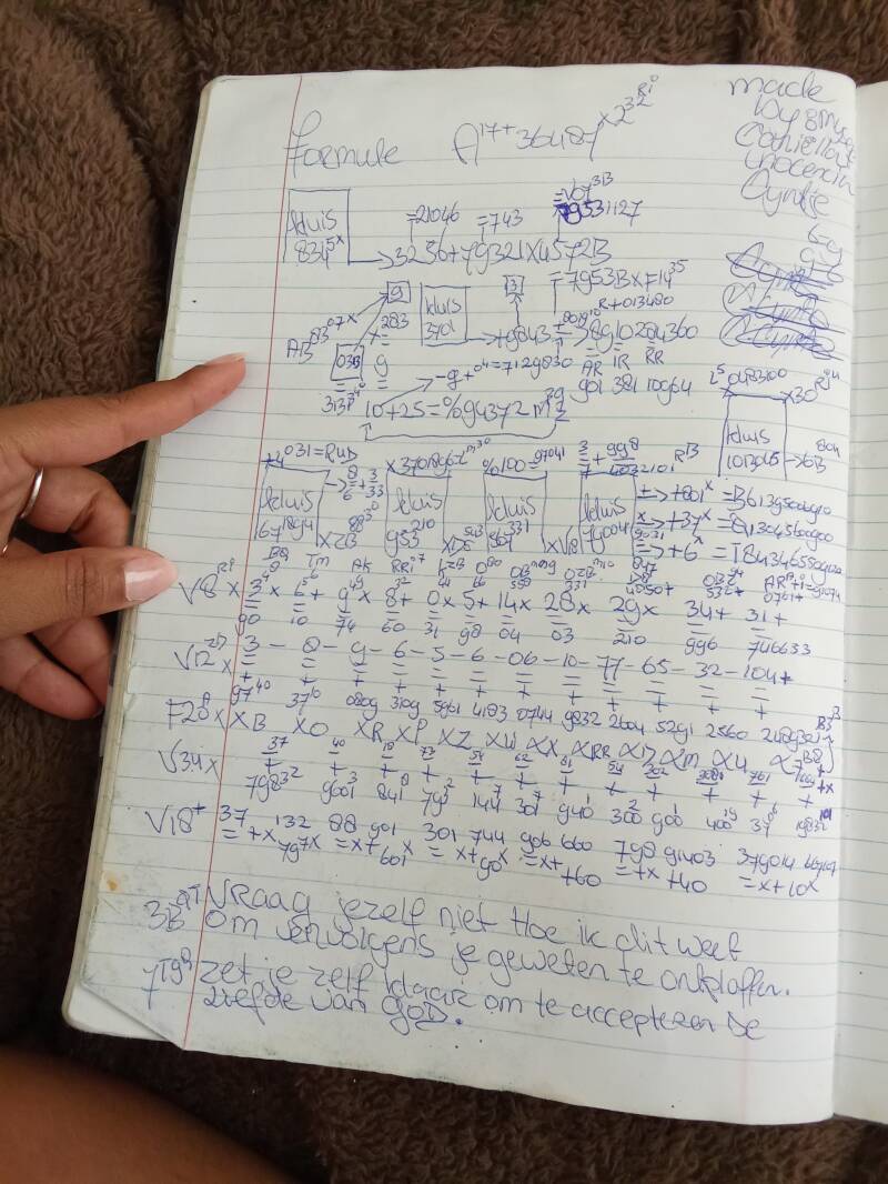 DENK ERAAN IS HEEL BELANGRIJK DAT JE NIET OP DE HANDSCHRIFT GAAT LETTEN , DAT HET NOU MOOI IS OF NIET, BELANGRIJK IS DAT HET ORIGINAL IS , : WAT JE NIET KAN BEGRIJPEN , PROBEER HET DAN TE ZIEN , PLAATS JE ZELF IN , ZODAT JE HET GOED KAN ZIEN, VERVOLGENS " : MIJN SOMMIGE NUMMERS ZIJN OOK LETTERS, MOCHT JE HET PAPIER VERDRAAIEN NAAR , "NOORD OOST WEST ZUID".