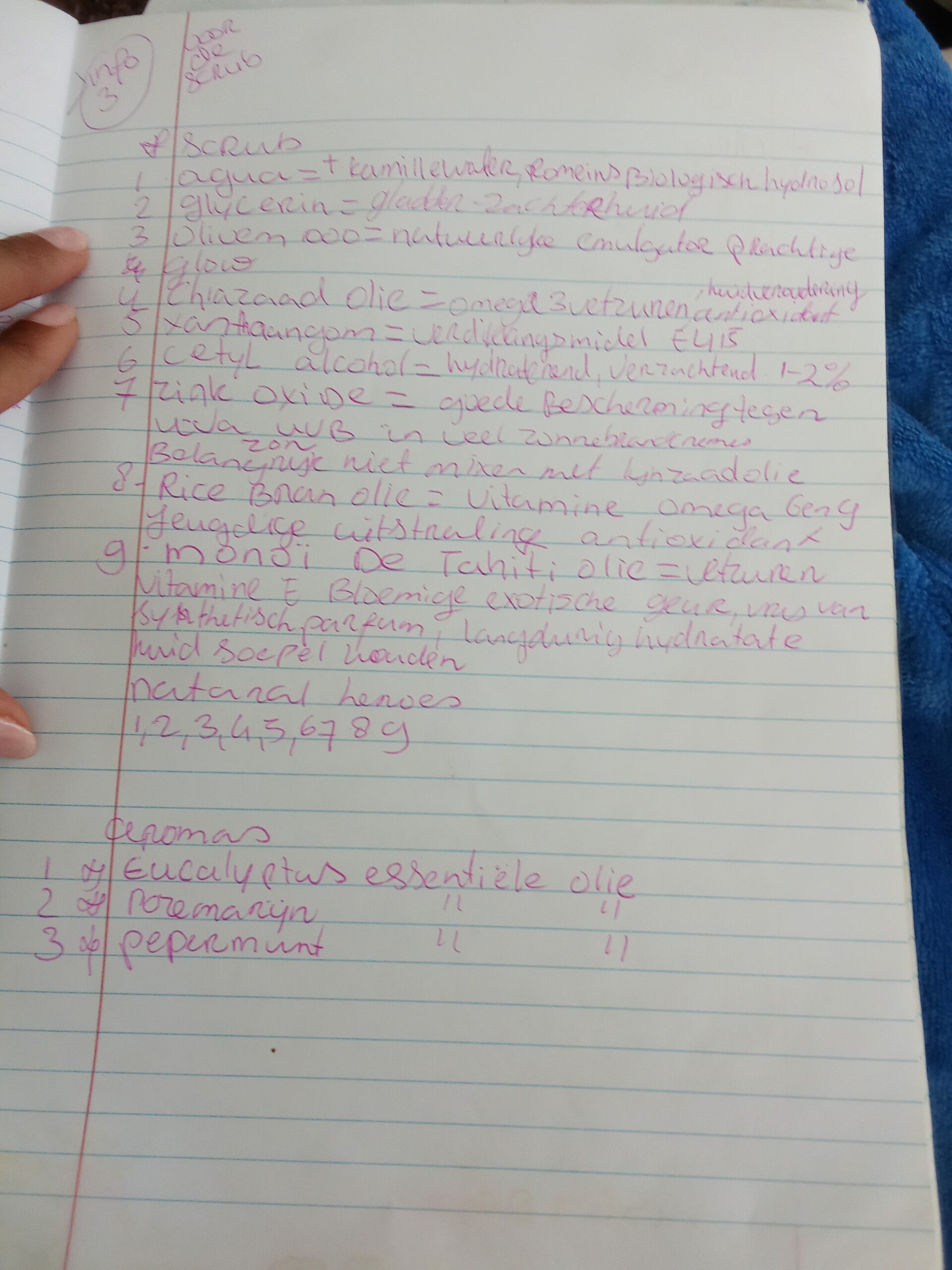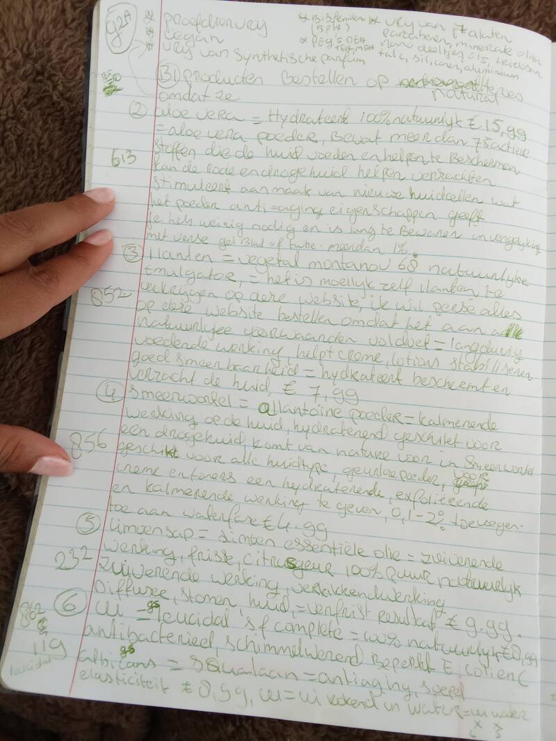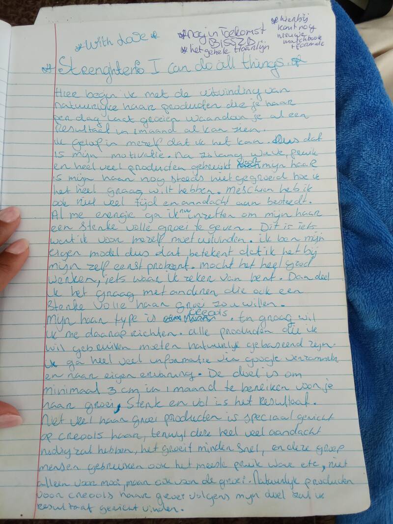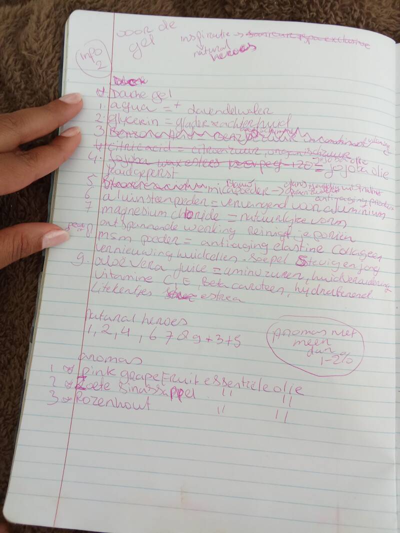 "GOED" IN DEZE "BLAUWESCHRIFT" HEB IK STAAN MIJN GECREEËRD FORMULA OP CURACAO, OM EN OM MET DE "PINKSCHRIFT" : DAT ZUL JIJ HIER OP DE PAGINA 1233 ZIEN, ,,, OOK HEB IK STAAN , MIJN "MARKETINGSPLAN" VOOR DE SOCIALMEDIA " WAT IK NATUURLIJK NIET GAAT PLAATSEN , EN OOK ALS EERSTE GECREEËRD EEN IDEE VOOR EEN SPECIAL"CREME LIJN MET ANDERE WOORDEN ," SCHOONHEIDSPRODUCTEN VOOR LICHAAM "DE HUID" EN GEZICHT, HET BEDOELING IS DAT IK MET SOMMIGE PRODUCTEN EEN EIGEN SCHOONHEIDSLIJN CREEERT. ZO DUS SOMMIGE PRODUCTEN HEB IK OPGESCHREVEN OM TE BESTELLEN, EN ZOCHT ER INFORMATIE OVER., EERDER HEB IK AL WELEENS EEN EIGEN LICHAAMSCREME MET NATUURLIJK PRODUCTEN GECREEËRD, , MAAR GOED IK HAD MEER PRODUCTEN NODIG ZODAT HET NIET GAAT " VERROTTEN" , "DAAROM HET IDEE".